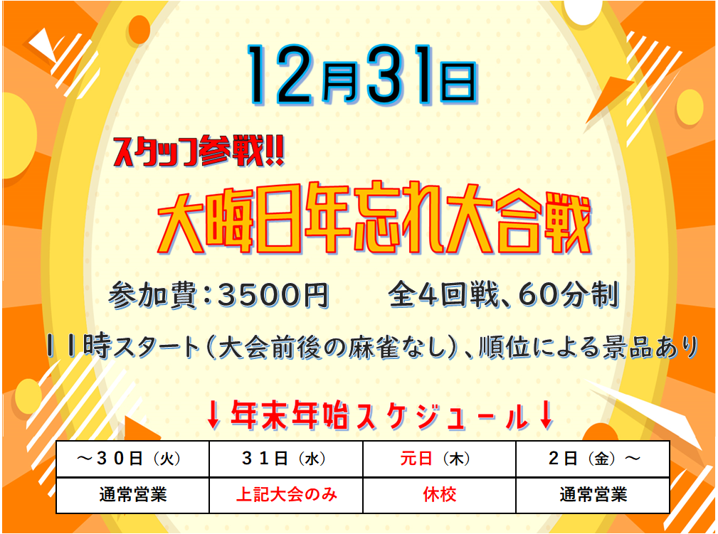 また、年末年始は上画像より、大晦日が上記大会元日は12時からOPENそれ以外は通常営業となってます!